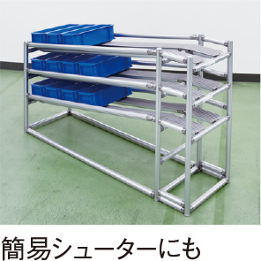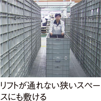 ◯ 手押しで移動でき、フォークリフトや台車への乗せ換え作業を削減、事故防止にも。