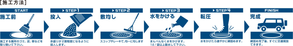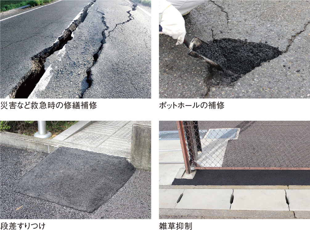 ◯ 高耐久・・・散水すると硬化し、加熱合材と同等の強度が得ら