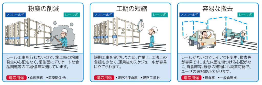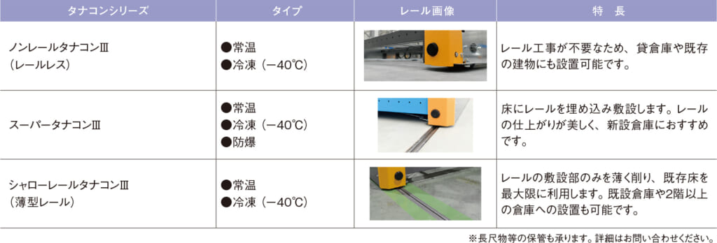 高性能ウレタン車輪を搭載し、大規模なレール工事を必要としないレールレス仕様のタナコンです。