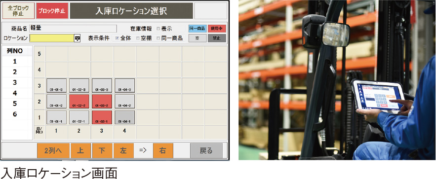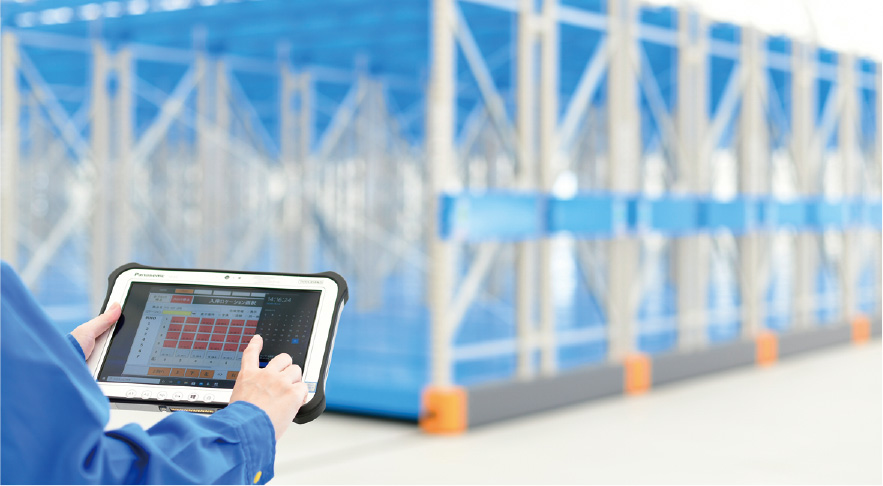どのラックに何の商品があるかタブレット画面上でわかるため、同じ通路内にある商品から効率よく入出庫作業ができます。